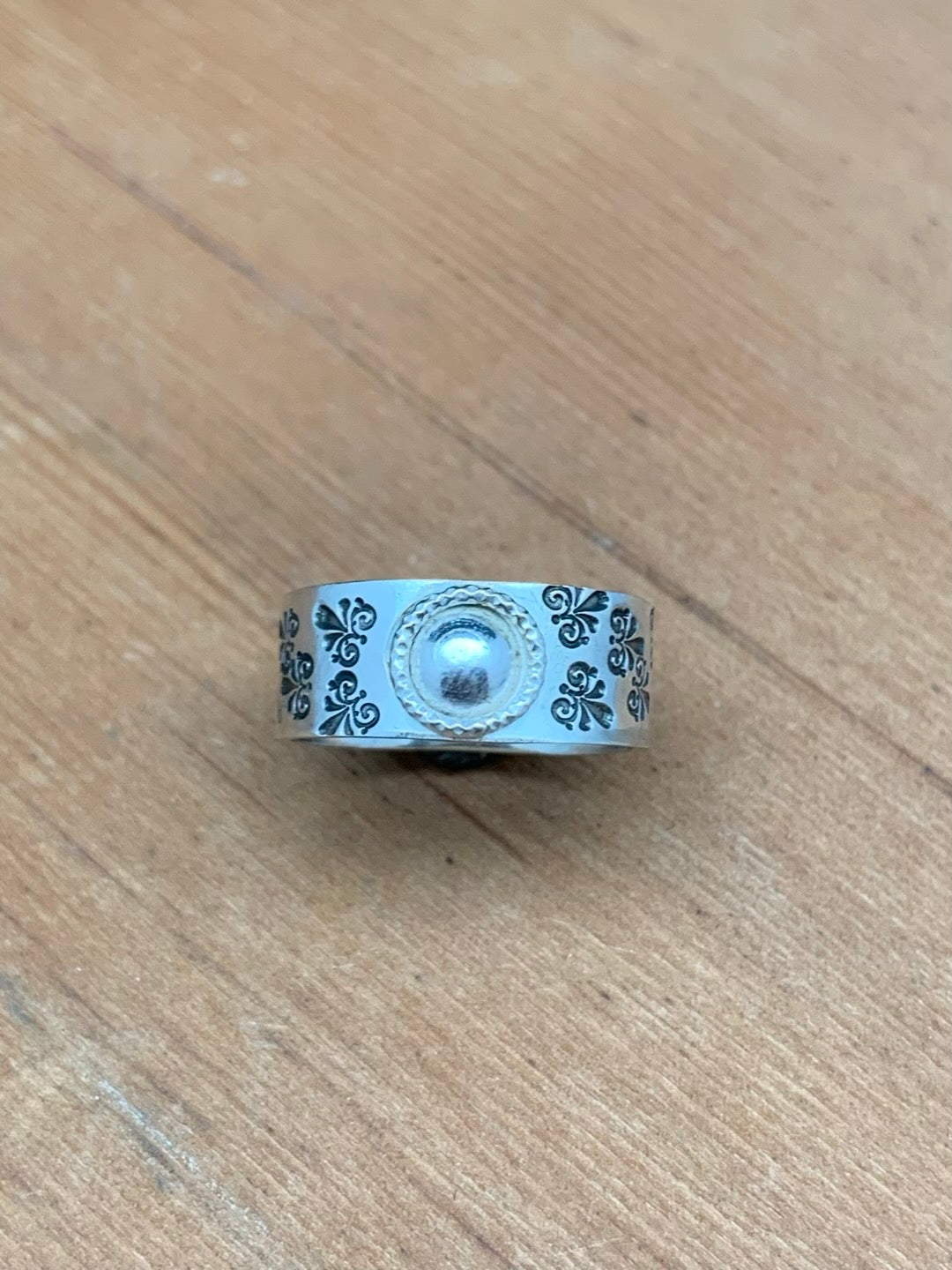 Wrap your finger in the embrace of the Enchanted Circlet, a beautifully crafted ring that exudes both tradition and modernity. This sterling silver band is a marvel of craftsmanship, featuring a distinctive round bump out design that adds depth and character. Each bump out is meticulously stamped with intricate patterns, evoking the timeless beauty of antique jewelry.